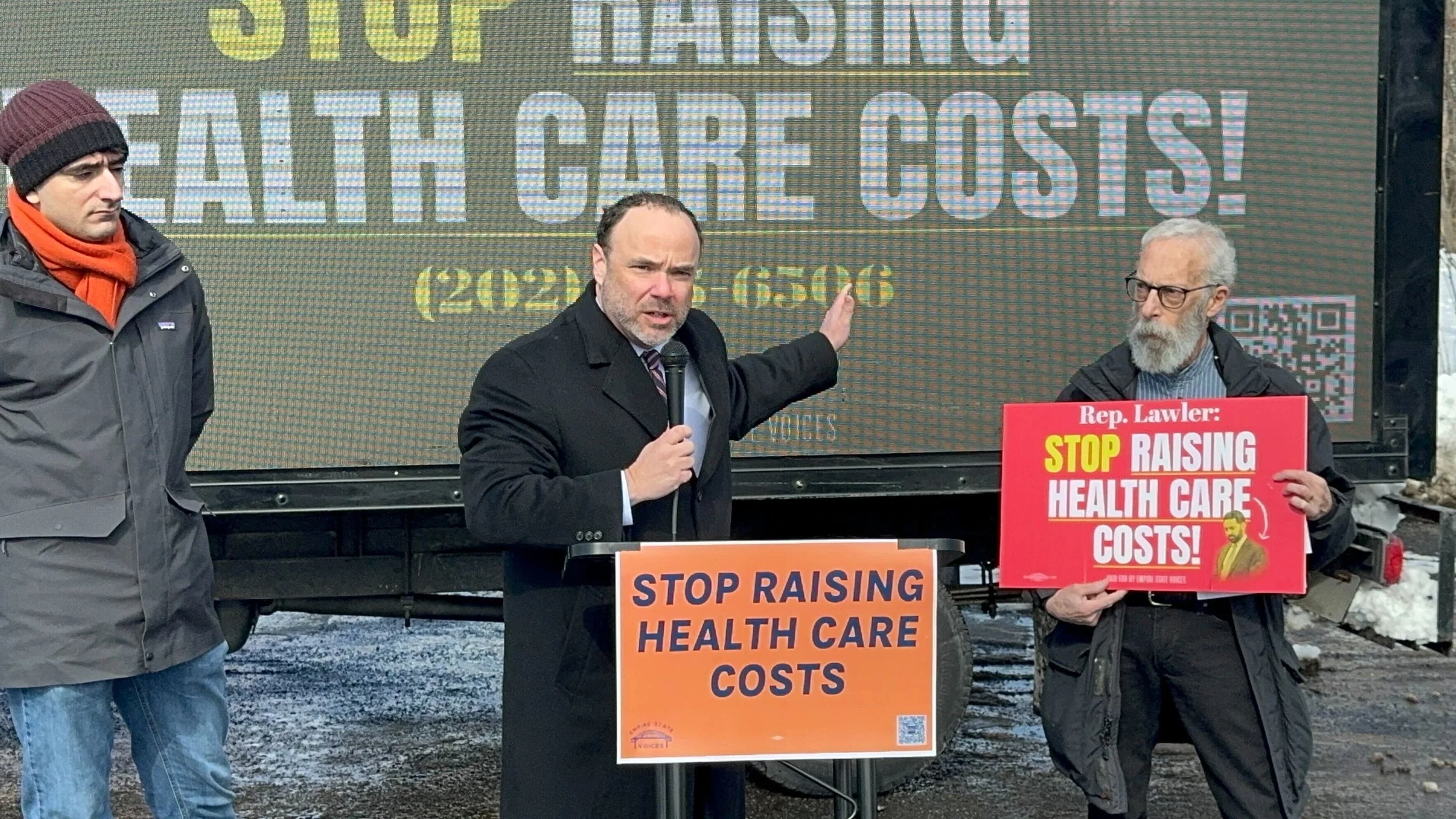 [Text: Tell Rep. Mike Lawler: Stop voting to make healthcare more expensive. (202) 225 6506]